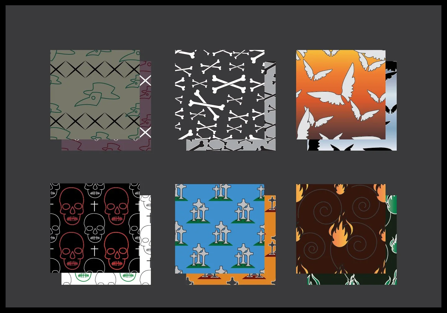 I drew simplified vector icons representing plague doctor masks, skulls, bones, tombstones, angel wings, fire