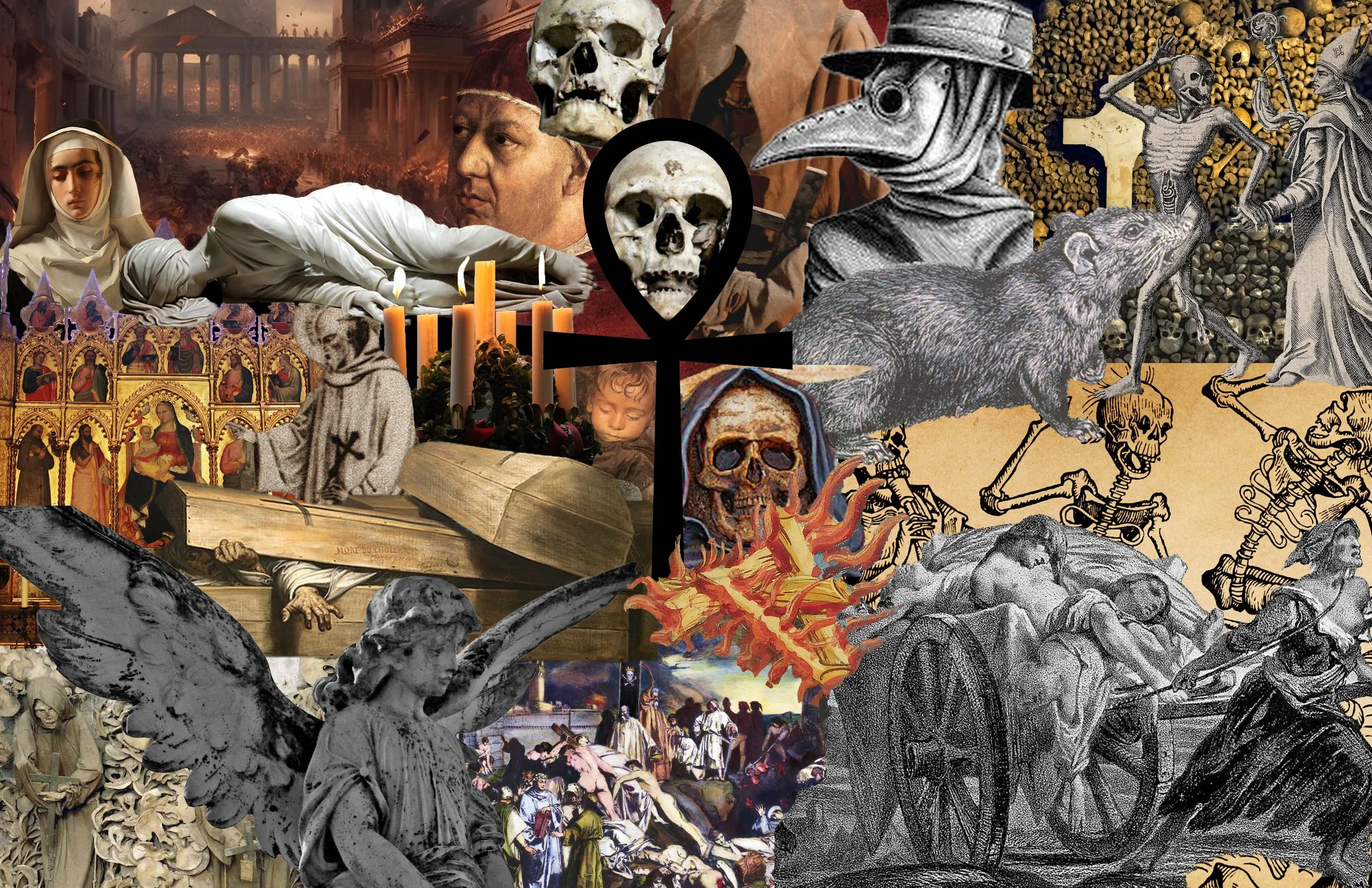I began by gathering historic plague-era references—woodcuts, manuscripts, religious paintings, plague doctors, ossuaries, skeleton motifs, and more.